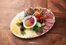 500 г • Пармская ветчина, колбаса копченая, сыр Моцарелла, сыр Джюгас, сыр Фета, свежий огурец, сладкий болгарский перец, томаты, домашняя горчица, домашний хрен