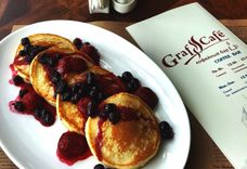 Оладьи мучные с томлёными ягодами (чёрная смородина и клубника)