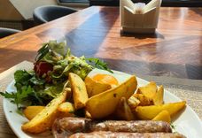 445 г • Колбаски деревенские, жареный картофель в дольках, яйцо жареное, свежие овощи