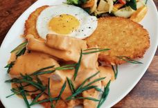 Со свининой в томатно-сметанном соусе, миксом свежих овощей и жареным яйцом