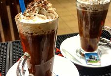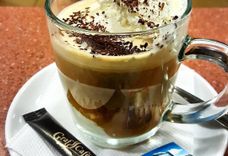 250 г • кофе, взбитые сливки, корица, тёртый горький шоколад
